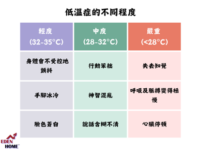 人體是一個精密的恆溫系統,正常體溫應維持在 37°C 左右。當身體流失熱量的速度快於製造熱量的速度,核心體溫便會下降。低溫症可按嚴重程度分為三級: