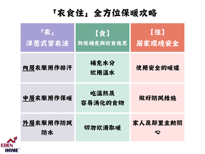 要預防低溫症,必須採取主動防禦策略。EDEN HOME建議可以從日常生活三大範疇入手。