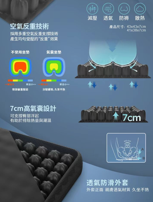 .柱型氣囊高7cm, 讓臀部與坐墊保持足夠距離, 起到保護皮膚與軟組織的目的
