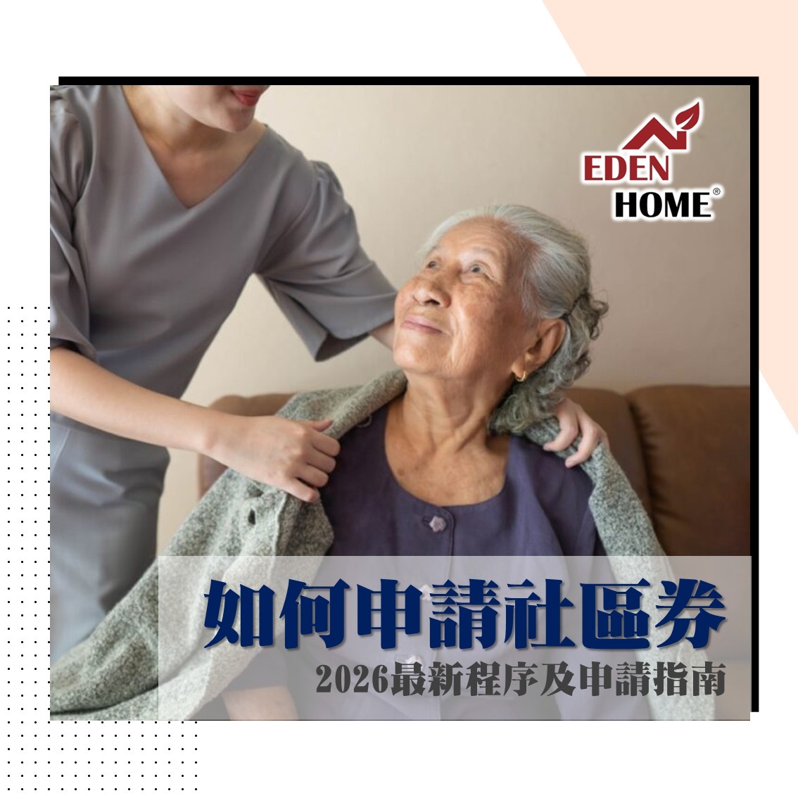 為支援越來越多的長者選擇居家安老,社會福利署已於2023年9月起將「長者社區照顧服務券計劃(CCSV)」(簡稱「社區券」)正式恆常化,標誌著它從試驗階段轉變為長期安老政策的核心組成部分,以應付人口老化的照顧需求。行政長官亦於<施政報告2025>中宣佈,於2026-2027年度再增加4,000張社區券至總數16,000張。本文將為您詳細解說2026年社區券的最新申請流程、資格條件和實用指南。 【了解服務】請瀏覽,EDEN HOME長者社區照顧服務券   1)    社區券的好處:為什麼需要申請?有別於傳統「社區照顧服務」(如:改善家居照顧服務),社區券採用「錢跟人走」的原則,將選擇權直接交到長者及其家人手中,如同使用消費券一樣,可以在全港18區的社署認可服務單位中,自由選擇最適合的服務組合,更具彈性。 2025-26年度社區券的主要特點包括:每月價值從4,459港元到最高10,664港元不等,取決於長者的照顧需求和經濟能力,可彈性選擇服務範圍擴大,現在可覆蓋輔助科技產品租借,如電動護理床、輪椅等使用靈活性增加,長者可同時向最多兩個服務單位選購服務計劃採用「共同付款」模式,長者僅需支付服務費的5%至40%(視乎家庭入息),其餘由政府資助  2) 2026年申請資格:誰能獲得社區券?社區券採用「邀請申請制」,並非所有長者都能主動申請。社會福利署會根據「資助長期護理服務中央輪候冊」的排序,主動向合資格長者發出邀請。社署主要依據三項核心標準進行篩選:年齡與身份要求:申請人必須年滿65歲或以上,且持有有效香港居民身份健康評估標準:需通過“安老服務統一評估機制”評估,結果顯示身體機能為中度或嚴重缺損服務輪候狀態:申請人必須正在中央輪候冊上,且尚未開始接受任何政府資助的社區或院舍照顧服務需要特別注意的是,即使長者正在使用綜合家居照顧服務或改善家居及社區照顧服務,也不影響申請社區券的資格。社區券計劃正是為了提供更多選擇而設立的替代方案。 3) 申請流程全解析:五步完成申請從收到邀請到正式使用服務,整個申請流程通常可在4週內完成。為了讓您更直觀地理解這一流程,以下是從收到邀請到開始服務的完整步驟圖:具體申請步驟詳解:接收邀請:社署會向符合資格的長者郵寄正式邀請信及申請表格。提交申請:填妥申請表後,可透過郵寄、傳真或社署的「長者服務券資訊系統」(VISE)網上平台提交。經濟狀況審查:社署會根據長者及其同住家人的總月入(不計算資產),確定「共同付款級別」。此級別共分六級,長者需自付的服務費比例介乎5%至40%之間。批出社區券:社署在收到申請後,大多會在四星期內完成審批。申請人如需接受抽樣家庭住戶收入審查,社署會另函通知並要求申請人按申請表上申報的資料提交有關證明文件副本。社署收妥所需文件及完成批核後,會通知有關長者審查結果,並正式批出社區券資格。選擇服務單位及啟用社區券:審批通過後,長者將收到「電子社區券」(註:現時社署不會再發出紙本社區券),必須盡快開始使用服務;如持券人在過去連續六個月或以上未有使用社區券購買任何社區券服務,獲發的社區券會自動失效。 【了解服務】請瀏覽,EDEN HOME長者社區照顧服務券  4) 如何選擇合適的服務單位?成功獲發社區券後,長者可從社署認可的服務單位名單中,自由選擇最適合的服務組合。服務主要分為以日間中心為基地的「中心為本」服務和專業人員上門的「家居為本」服務,或可選擇「混合模式」面對眾多認可服務單位,做出合適選擇至關重要。建議你參閱「如何選擇長者社區照顧服務券計劃(社區券)認可服務單位?」 ,文章詳盡介紹社區券的運作方式、如何搜尋認可的服務單位,以及選擇這些服務機構的原則。  5) 常見問題問:使用社區券會影響輪候政府資助院舍嗎? 答:不會。長者在中央輪候冊上的院舍輪候位置會轉為「非活躍」,但其輪候次序和登記日期將被保留。若未來有需要,可隨時申請轉回「活躍」狀態。 問:家中已聘有外傭,還需要申請社區券嗎? 答:兩者可以互補。外傭主要負責日常起居照顧,而社區券可換取護士、治療師等專業人士的上門服務,填補外傭在專業護理和復康方面的知識缺口。 問:對當前服務單位不滿意,可以更換嗎? 答:可以,這是「錢跟人走」計劃賦予長者的重要權利。只需按合約要求通知原單位終止服務,即可轉換至新的認可服務單位。 其他關於社區券的資料,建議可參閱 社會福利署的網頁 https://www.swd.gov.hk/tc/pubsvc/elderly/cat_commcare/psccsv/index.html  6) 總結社區券計劃是香港政府支援居家安老的重要舉措,讓長者能在熟悉的環境中獲得專業照顧。這項計劃不僅減輕了家庭照顧者的負擔,也尊重了長者的自主選擇權。成功申請社區券只是第一步,關鍵在於積極主動地比較和選擇服務,並與服務提供者保持良好溝通,定期檢視照顧計劃。只有這樣,才能讓這份資助發揮最大效益,真正提升長者的生活質素與尊嚴。 EDEN HOME具多年相關服務經驗,口碑及服務質素備受肯定,如果您對社區券申請有任何查詢,歡迎致電3916 7834或 whatsapp 6745 5121(📲查詢),樂意為你提供專業支援。    【了解服務】請瀏覽,EDEN HOME長者社區照顧服務券