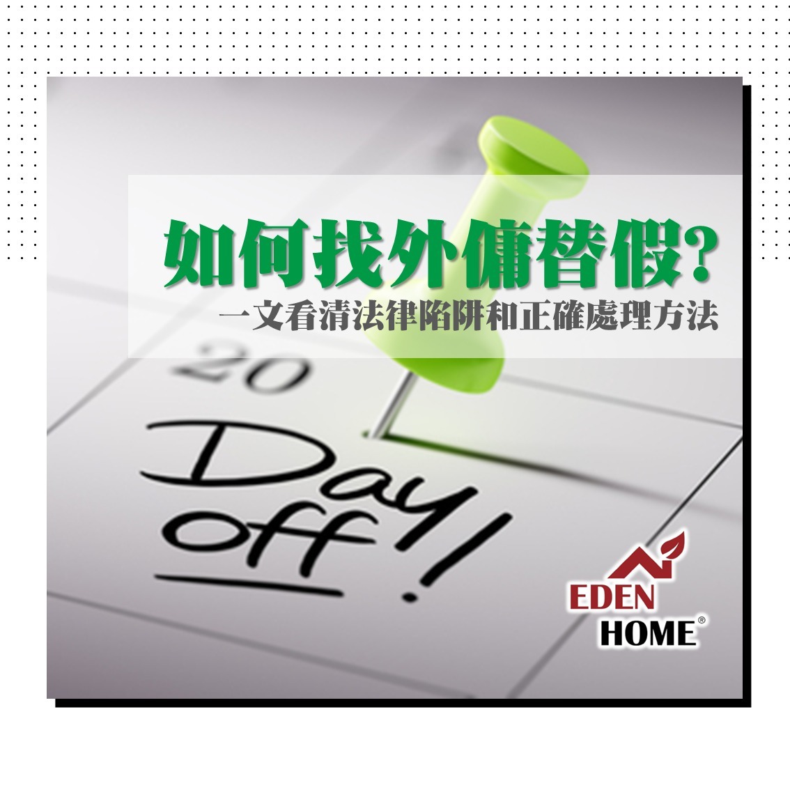 每當外傭(工人姐姐)放假時候,僱主都常常因而感到困擾,擔心家中長者或孩童沒有人照顧。因此不少僱主常常提問:「可否短期聘用外傭?」、「有否外傭可以安排逢星期日到我家工作」。本文將向僱主作重要提醒,應正確認識香港相關法例,以免誤墜法網!  1.    常見謬誤EDEN HOME多年來致力提供外傭看護服務,經常收到相關查詢;歸納以下是常見的誤解,提醒僱主必須留心法律陷阱:  謬誤1 – 「外傭休假時,我可否僱用別人的外傭為我兼職工作,擔任替工?」答案:不可以!  謬誤2 – 「我已經與某外傭簽訂合約,他/她正留港等候批出新簽證,我可否先安排他/她到家中工作?」答案:不可以!  謬誤3 - 「家人/朋友可暫借他的外傭到我家工作應急,外傭可否在僱主同意下從事兼職工作?」答案:不可以!  根據香港法例,外傭獲許來港只可以為標準僱傭合約(ID407)內訂明的僱主工作。他/她在未獲得入境事務處處長批准前,不得由其他僱主僱用。同樣,外傭留港等候新簽證期間(即未批出時),亦不能從事任何工作。根據《入境條例》,除了外傭的簽證上載明的僱主以外,外傭替任何其他人士從事任何僱傭工作即屬違法;相關僱用人士亦同樣違法,僱用不可合法受僱的人是嚴重罪行,會受到檢控。 如僱主欲對外籍家庭傭工的申請程序有更多了解,可參閱入境事務處相關網頁:https://www.immd.gov.hk/hkt/faq/foreign-domestic-helpers.html  2.    外傭替代方案:正確處理方法因聘用外傭從事兼職工作屬違法,建議僱主應該考慮其他人手替代方案(如:安排家人輪流照顧家庭);然而亦明白香港人面對生活和工作拉扯,實在吃不消,聘用其他支援人手亦在所難免。因此建議僱主可考慮:  -          如果處理家務工作,可聘用兼職或短期本地家務助理;詳情可參閱:「樂活一站」: https://www.erb.org/smartliving/tc/main/  -          如果是照顧孩童,建議使用課餘託管服務、社區保姆服務;詳情可參閱:「社會福利署 兒童照顧服務」:https://www.swd.gov.hk/tc/pubsvc/family/cat_childcareservice/  -          如果是照顧長者,建議可以使用日間護理中心、到戶看顧等服務;詳情可參閱專頁內另一篇文章: 「工人(外傭)放假,家中長者無人照顧,怎麼辦?」 同時,如果是社會福利署「長者社區照顧服務券計劃」(CCSV)持有人,更可獲政府資助使用服務,減輕財政負擔。【了解服務】EDEN HOME長者社區照顧服務券  3.    結語 – 及早準備,善用社區資源由於聘用外傭手續程序需時,建議僱主預留至少3個月時間 (即使聘用已完約本地外傭,最快亦需要4至6星期或以上辦理時間),及早準備,以免大失預算。同時,所有外傭皆需要放取休息日、法定假期和年假,僱主應好好規劃家庭照顧安排,並善用上述建議的社區資源,舒緩照顧壓力。  如有查詢,歡迎聯絡致電 3916 7834 或 whatsapp 6745 5121(📲查詢) 查詢。EDEN HOME專業團隊樂意為您提供支援! 【了解服務】 EDEN HOME外傭看護服務
