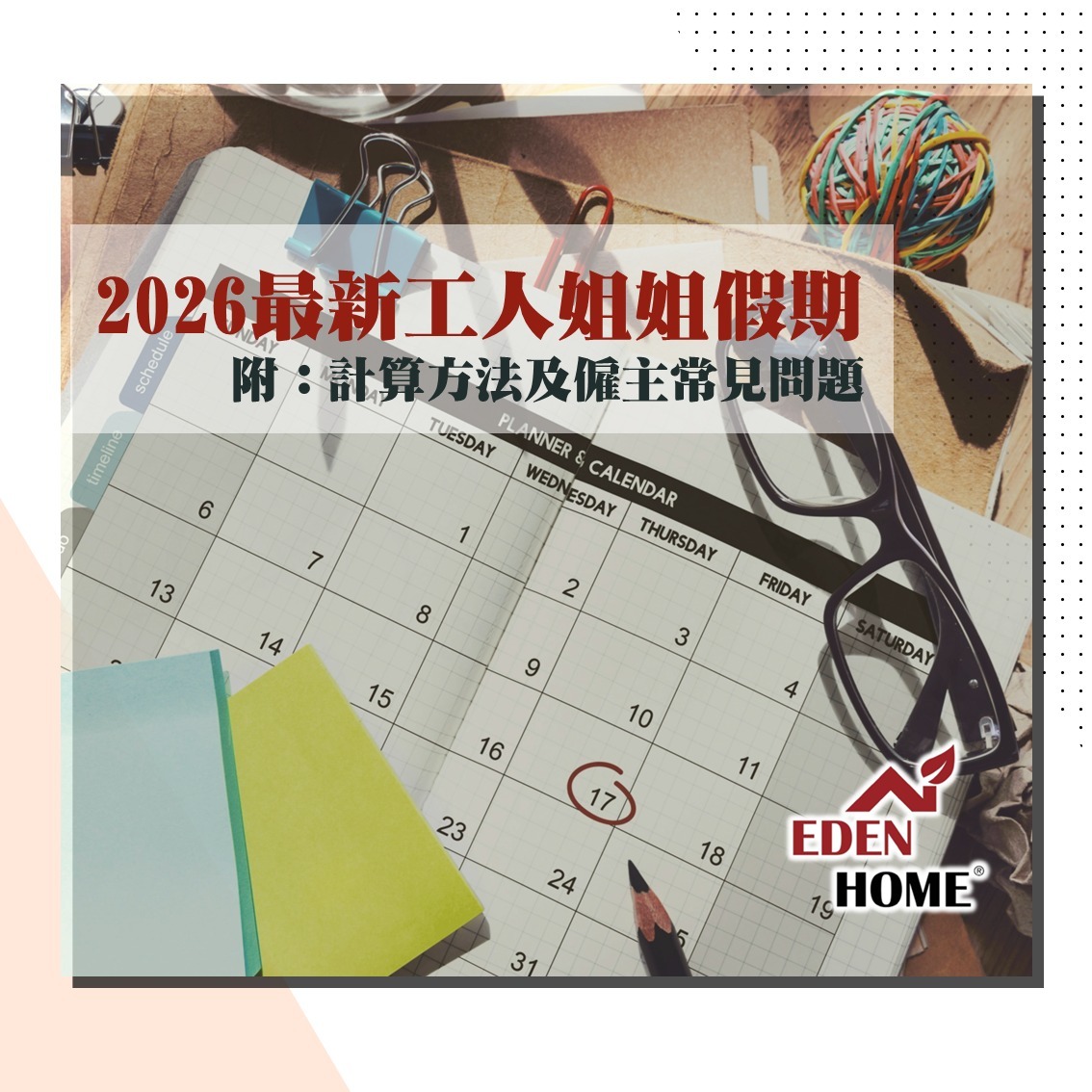 根據香港《僱傭條例》及標準僱傭合約,外籍家庭傭工(外傭/工人姐姐),不論是菲傭、印傭或其他國籍外傭,均享有法定假日、有薪年假及休息日的保障。EDEN HOME具資深外傭服務經驗,向僱主分享2026年最新的相關安排: 【了解服務】請瀏覽,EDEN HOME外傭看護服務  (一)  2026年法定假日(勞工假)根據勞工處最新公佈,2026年合共有15天法定假日(俗稱「勞工假」):(1)        元旦 (2026年1月1日)(2)        農曆年初一     (2026年2月17日)(3)        農曆年初二     (2026年2月18日)(4)        農曆年初三     (2026年2月19日)(5)        清明節     (2026年4月5日)(6)        復活節星期一* (2026年4月6日)(7)        勞動節     (2026年5月1日)(8)        佛誕          (2026年5月24日)(9)        端午節     (2026年6月19日)(10)    香港特別行政區成立紀念日 (2026年7月1日)(11)    中秋節翌日     (2026年9月26日)(12)    國慶日     (2026年10月1日)(13)    重陽節     (2026年10月18日)(14)    冬節 或 聖誕節(由僱主選擇)(2026年12月22日 或 12月25日 )(15)    聖誕節後第一個周日     (2026年12月26日) *請注意最新2026年政策 - 根據《2021年僱傭(修訂)條例》,2026年起新增復活節星期一為法定假日,即全年由14日增至15日法定假日 可參閱 - 勞工處官方參考資料: https://www.labour.gov.hk/tc/news/latest_holidays2026.htm  (二)  有薪年假計算外傭按連續性合約受僱每滿 12 個月,便可享有有薪年假。有薪年假的日數按外傭受僱年資由 7 天遞增至最高 14 天,計算方法如下: 首2年:即「第一份」<僱傭合約>-          工作滿第1年:每年7天有薪年假-          工作滿第2年:每年7天有薪年假 第3至4年:如續約,即「第二份」<僱傭合約>-          工作滿第3年:每年8天有薪年假-          工作滿第4年:每年9天有薪年假 第5至6年:如續約,即「第三份」<僱傭合約>-          工作滿第5年:每年10天有薪年假-          工作滿第6年:每年11天有薪年假 第7至8年:如續約,即「第四份」<僱傭合約>-          工作滿第7年:每年12天有薪年假-          工作滿第8年:每年13天有薪年假 第9年或以上:如續約,即「第五份」或以上<僱傭合約>-         工作滿第9年或以上:每年14天有薪年假 *根據勞工處指引,實際發放年假日期應由僱主在徵詢外傭後訂立。僱主須至少在假期開始的14 天前以書面通知外傭年假的日期;如雙方同意,可以較短時間通知。除此之外,「標準僱傭合約」第13條規定,如僱主與傭工續約,傭工必須在新合約生效前,返回其原居地放取不少於7天的有薪/無薪假期(除非事先獲得入境處處長批准在港延期逗留),費用由僱主支付。僱主應妥善保存外傭的假期及工資紀錄,避免日後發生爭議。 【了解服務】請瀏覽,EDEN HOME外傭看護服務  (三)  休息日根據法例,外傭每 7 天可享有不少於 1 天休息日,而休息日是有薪的,且應為連續24小時。原則上應安排在星期日,但可雙方同意調整;在外傭同意下,僱主可另定休息日,代替原來指定的休息日。另定休息日須安排在同一個月內的原定休息日之前,或在原定休息日後的 30 天之內。  (四)  僱主常見問題 FAQQ1:如果法定假日適逢休息日(即假期日重疊)需要補假嗎,是否需要補假?A: 是的。根據《僱傭條例》,如法定假日適逢休息日,應於翌日補假。該補假為有薪假期。以2026年實際情況為例,如某外傭的休息日是星期日,由於重陽節(2026年10月18日)這日的法定假日適逢星期日,僱主應於翌日補假(即2026年10月19日),但這日須並非法定假日、另定假日、代替假日或休息日的日子。 Q2:2026年是否有新增法定假日?A: 是的!2026年最新政策法定假日為15天 - 根據《2021年僱傭(修訂)條例》,2026年起新增復活節星期一為法定假日。 Q3:外傭工作未滿一年辭職,僱主是否須按比例支付年假薪酬?A: 如僱員在一個假期年內受僱滿3個月但不足12個月,除因犯嚴重過失而遭即時解僱外,則不論以任何理由終止僱傭合約,都可獲發放按比例計算的年假薪酬。 Q4:可否要求外傭在法定假日工作?A: 可以,但如果外傭在法定假日工作,僱主須事先徵得外傭同意,並必須在60天內補假,並且至少提前48小時通知外傭。建議僱主盡可能提早通知,方便雙方做好安排  (五) 僱主須知為與外傭建立良好關係,EDEN HOME給僱主溫馨提示,以妥善處理假期安排:-          提前規劃:建議在年初與外傭商討全年假期安排,避免衝突-          書面記錄:假期安排最好有書面記錄,雙方簽署確認-          尊重文化:考慮外傭的文化及宗教需求,合理協商假期-          遵守法例:違反假期規定可被定罪-          替代方案:為避免長者或幼兒缺乏照顧,僱主應考慮外傭放假期間之支援安排。【延伸閱讀】工人(外傭)放假,家中長者無人照顧,怎麼辦?及 如何找外傭替假? 一文看清法律陷阱和正確處理方法  有用資源勞工處諮詢熱線:2717 1771勞工處外籍家庭傭工專頁:https://www.fdh.labour.gov.hk/tc/faq.html入境事務處外傭簽證事宜:2824 6111 EDEN HOME 外傭看護服務有別於一般僱傭服務,我們專注提供外傭護老的專業服務,多年來已支援過千家庭,服務質素備受肯定。透過我們全面的服務配套,提升印傭為「外傭看護」,為長者提供貼心照顧。歡迎致電3916 7834 或 whatsapp 6745 5121(📲查詢) 查詢詳情。 【