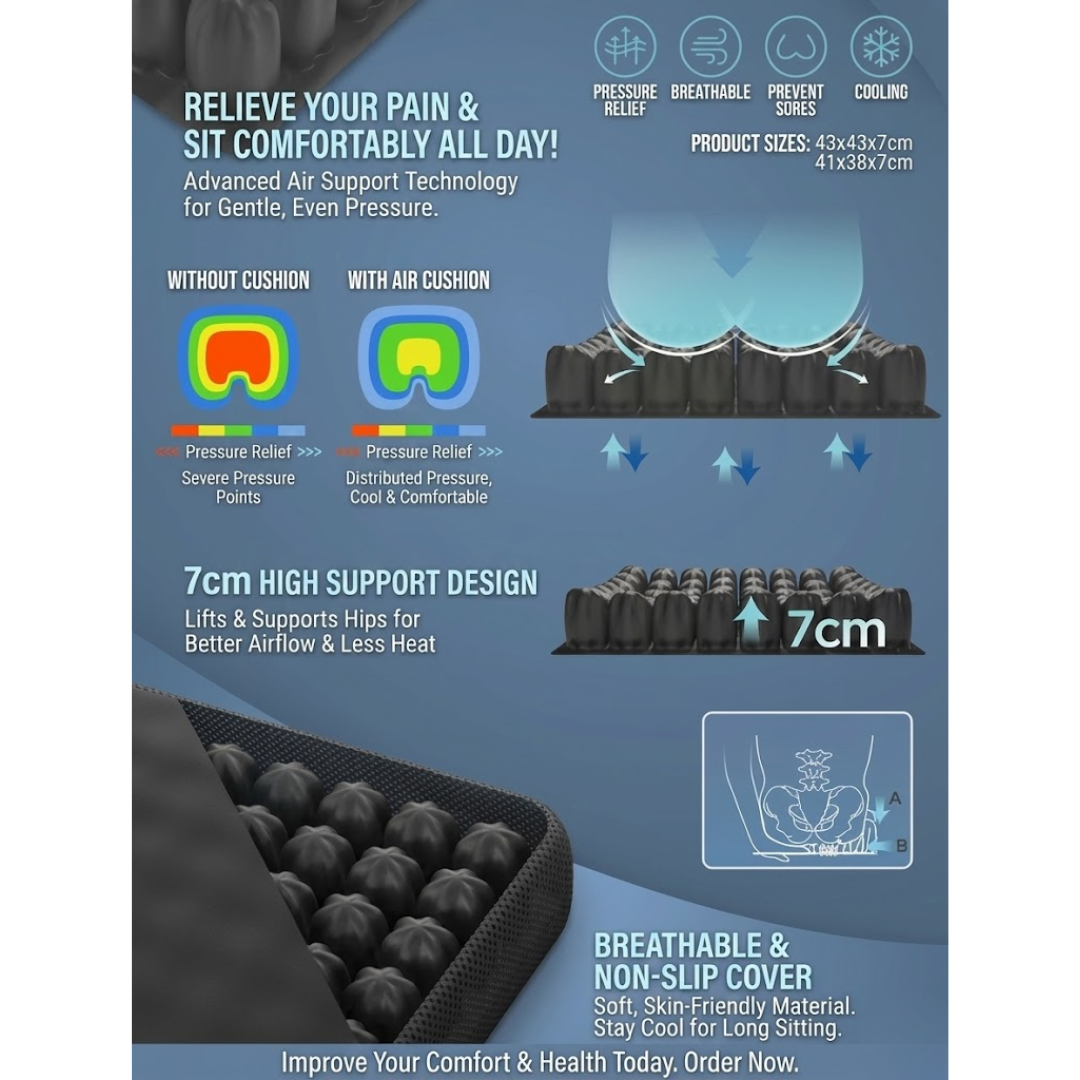 充氣後高度達 7 公分(cm),提供充足的緩衝空間。 確保用家的臀部猶如「浮」在空氣層上,防止坐骨直接觸碰到下方的硬板凳或輪椅座面。 為骨突處提供極佳保護,避免皮膚與硬物直接摩擦造成損傷。