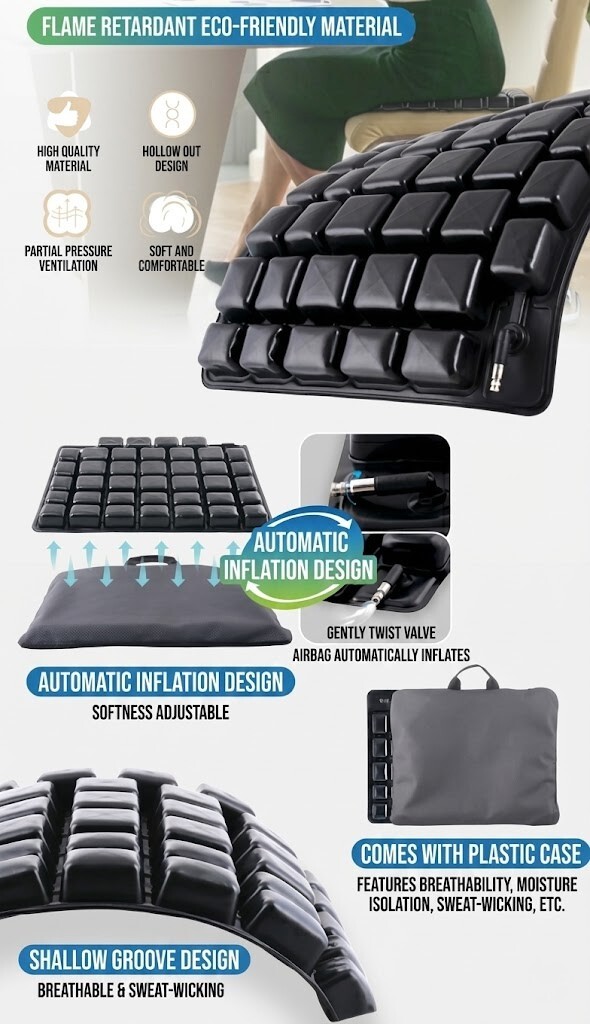 採用特殊的「方格型氣囊」結構,能有效將身體重量平均分散,避免壓力集中於尾椎骨或臀部尖端(坐骨結節)。 特別適合臀部肌肉流失、骨突明顯的長者或身形較瘦的用家。 透過減少局部皮膚長期受壓,能減低久坐帶來的不適與痠痛,從而達到預防壓瘡(褥瘡)形成的關鍵護理效果。