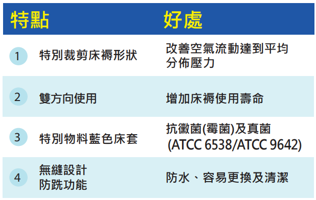.床褥獨有的專利設計,允許壓力平均分佈,減低褥瘡產生的機會,倍感舒適