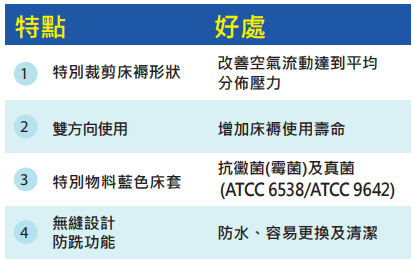 .床褥獨有的專利設計,允許壓力平均分佈,減低褥瘡產生的機會,倍感舒適