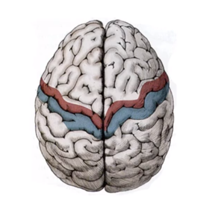 .在大腦的模型中, 我們可以看見藍色部分為體感皮質(somatosensory cortex), 而紅色部分為運動皮質(motor cortex), 運動皮質(motor cortex)控制我們的活動, 兩組皮質互相緊密合作去控制我們的身體
