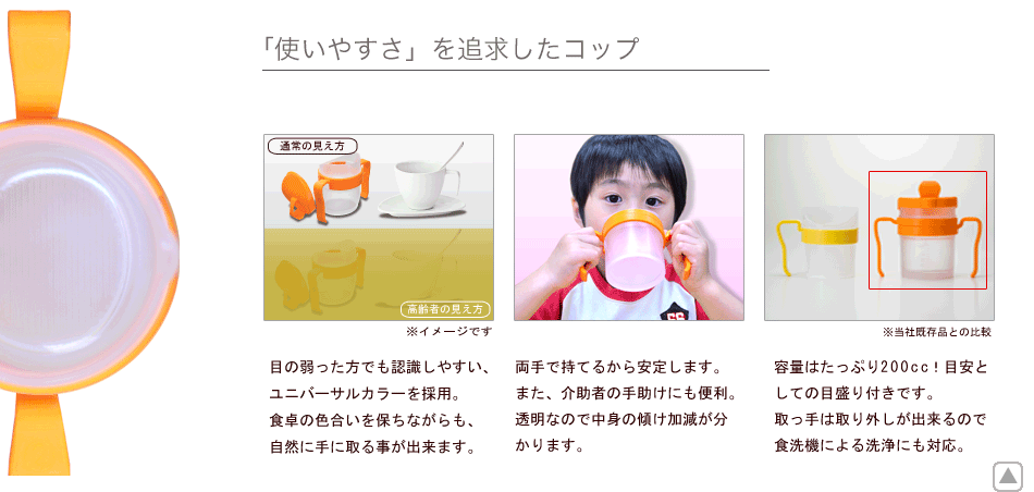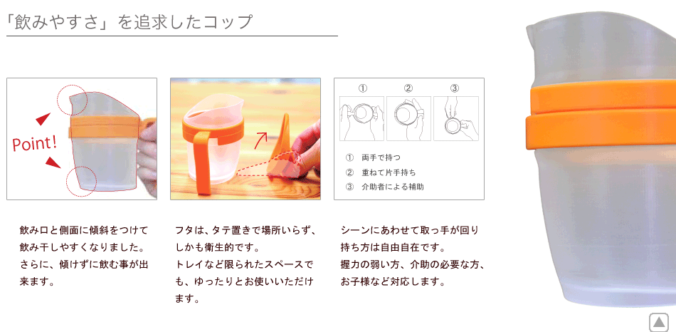 ‧ 杯柄旋轉設計,多種使用方法,包括:(a) 單手握杯 // (b) 雙手握杯 // (c) 飲者單手握杯,另一側由護理者握杯以協助飲用